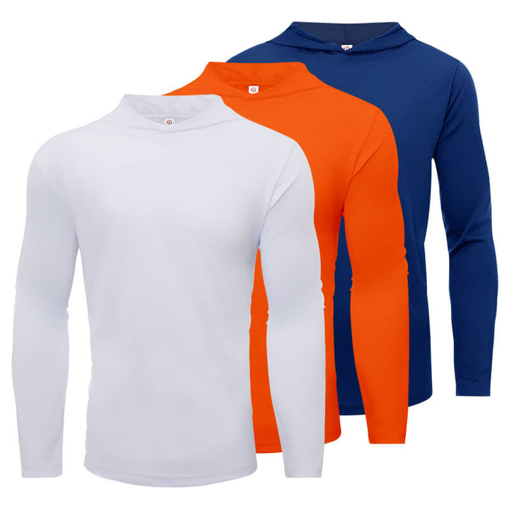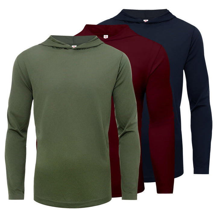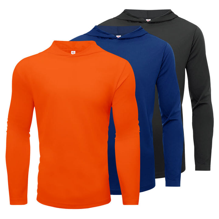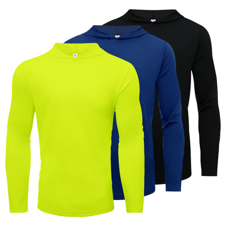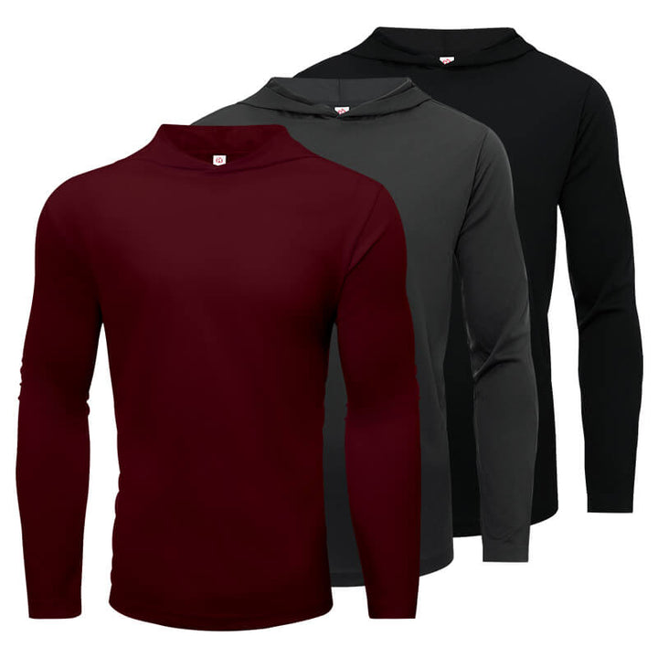 This 3-pack of men's performance long sleeve shirts with a hood is designed to be durable and breathable.